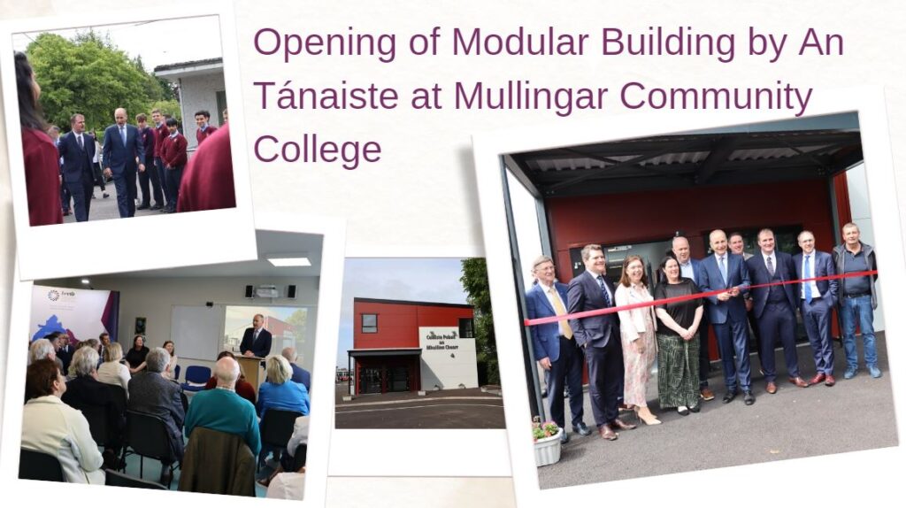 Tánaiste Micheál Martin said “I’m delighted to officially open this new modular accommodation at Mullingar Community College today. This state-of-the-art facility, with specialised SEN classrooms and versatile learning spaces, represents our unwavering commitment to providing high-quality education and modern facilities for all students. This new block will greatly enhance the learning environment for both staff and students, especially those with special educational needs. It stands as a testament to our dedication to fostering inclusive and supportive educational communities.”